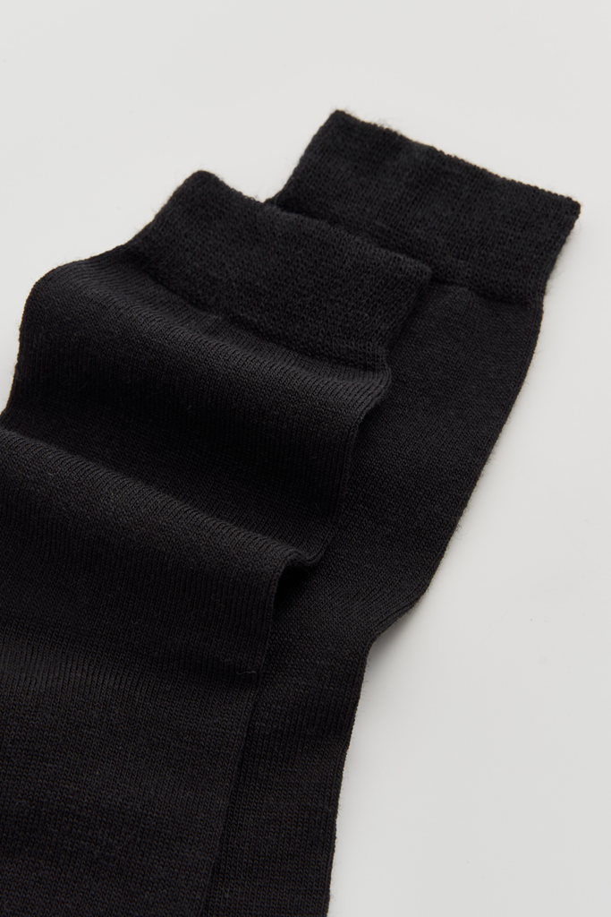 Designed in Scotland woven with premium merino wool, these socks offer exceptional softness, comfort, and fit. Their drape and high-contrast colours elevate any footwear. A touch of luxury for everyday wear. A deep, true black.